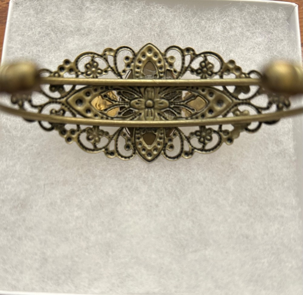 A vintage inspired charming bracelet created using an ornate filigree cuff, an elegant horse cameo, and two gold tone vintage flowers.