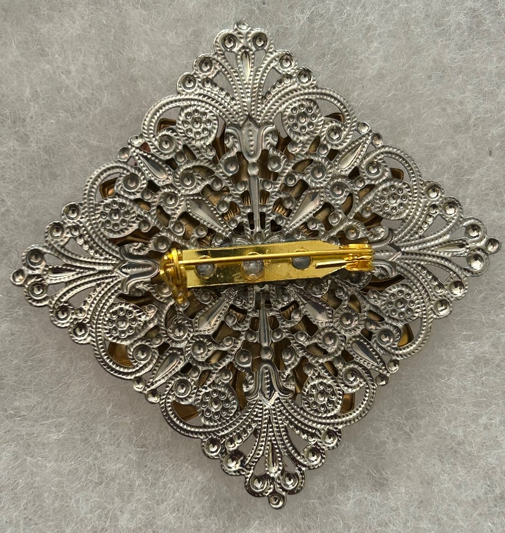 This tricolor brooch is handmade using vintage stampings and an ornate butterfly with raised wings.