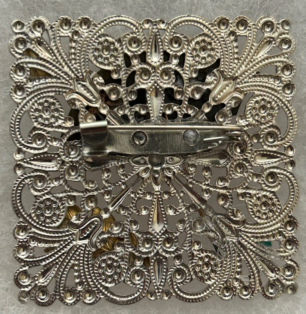 A whimsical brooch created using vintage stampings, a vintage umbrella cabochon, a vintage head pin, and a vintage teardrop clear crystal stone.