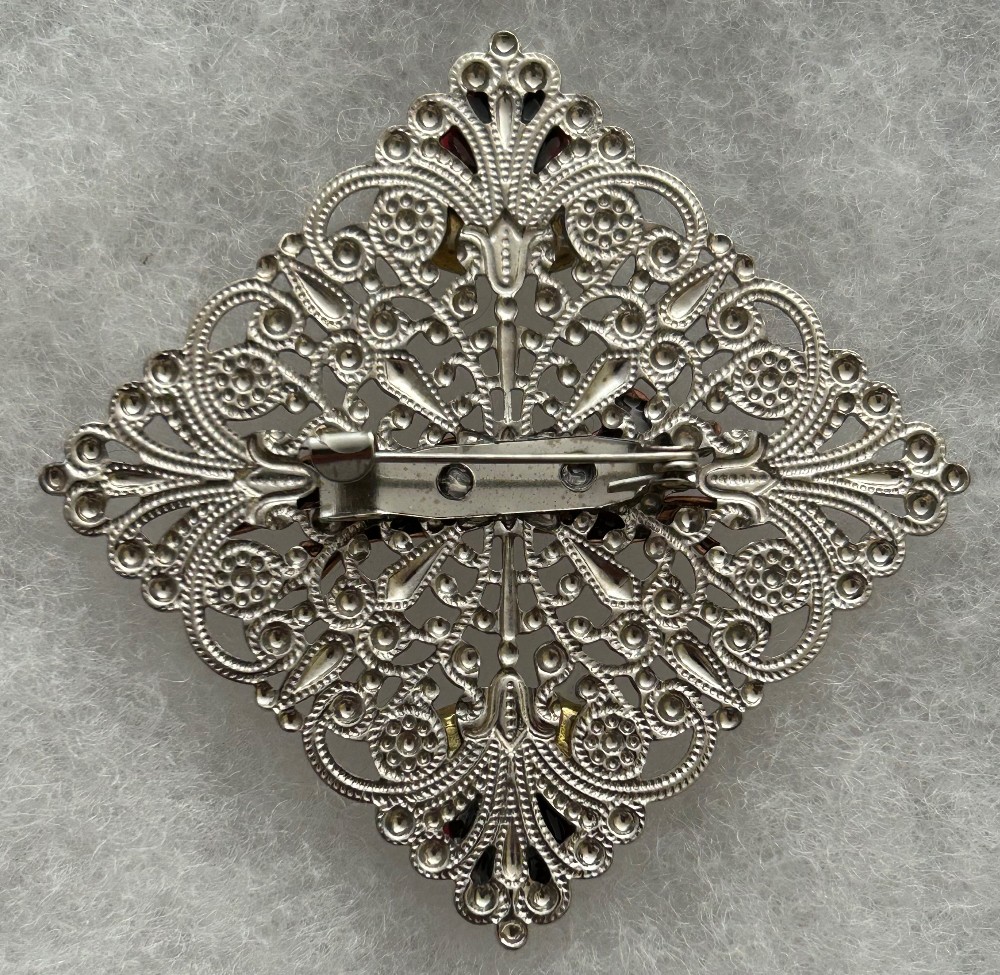 An eye catching brooch created using vintage stampings, vintage light green marquis stones, and red/black resin roses.